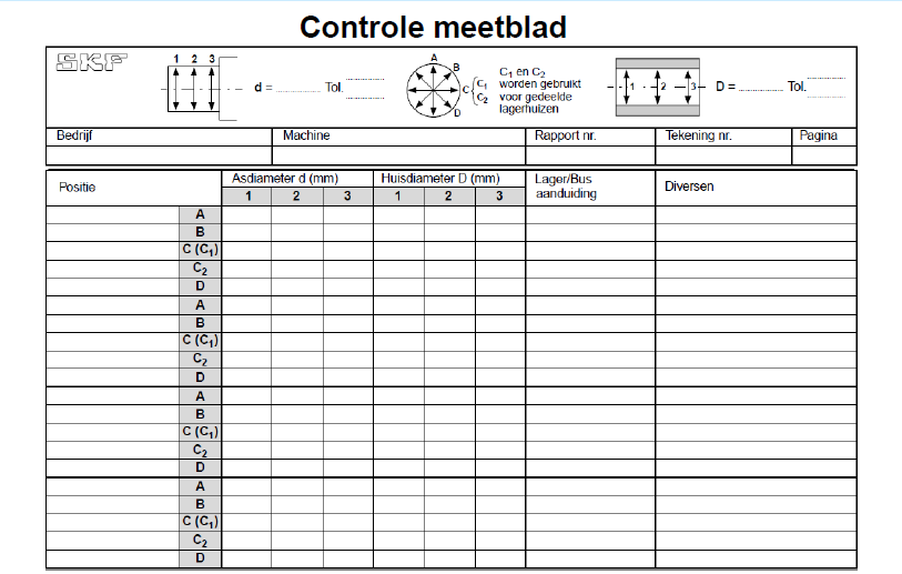 Hieronder kunnen jullie een voorbeeld vinden van een meetblad, hierop worden alle maten gestructureerd genoteerd ter controle. Dit zorgt voor een duidelijk overzicht van de bemating, welk soort passing het gaat en het tolerantieveld.